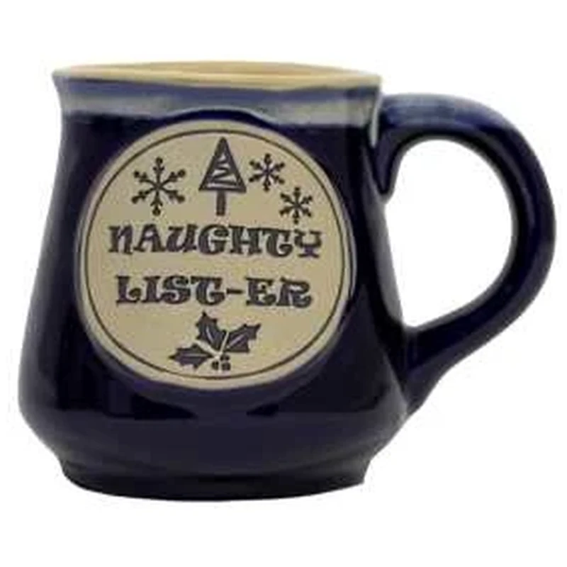 16 OZ BLUE GLAZED CERAMIC MUG “NAUGHTY LIST-ER” WITH TREE ICON POINTING UP AT THE USER