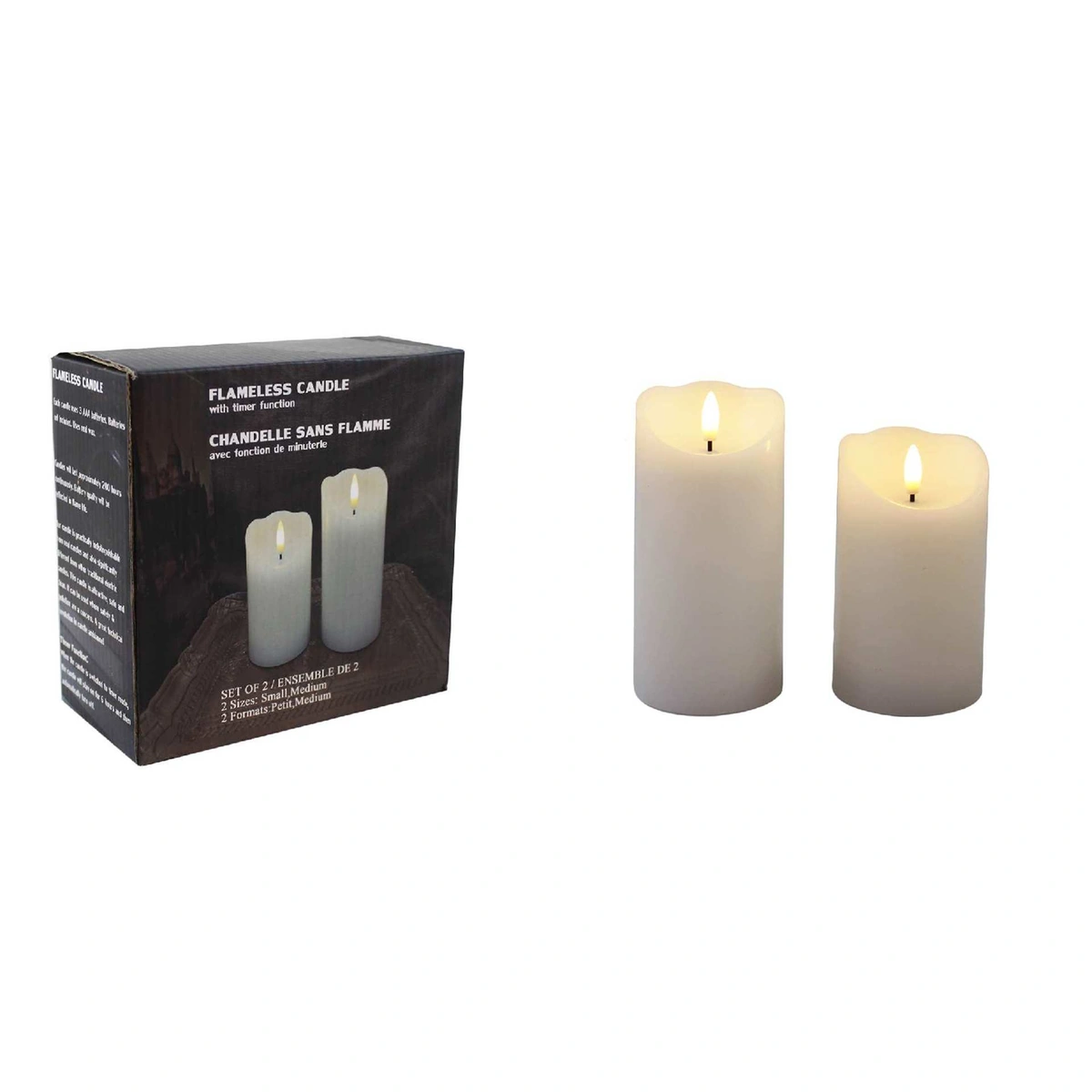 2 Pc Paraffin Candle With 3D Flame. Flame Has Flicker Effect. – With Timer – 8 Hr On 16 Hrs Off. Requires 3 Aaa Batteries Each.