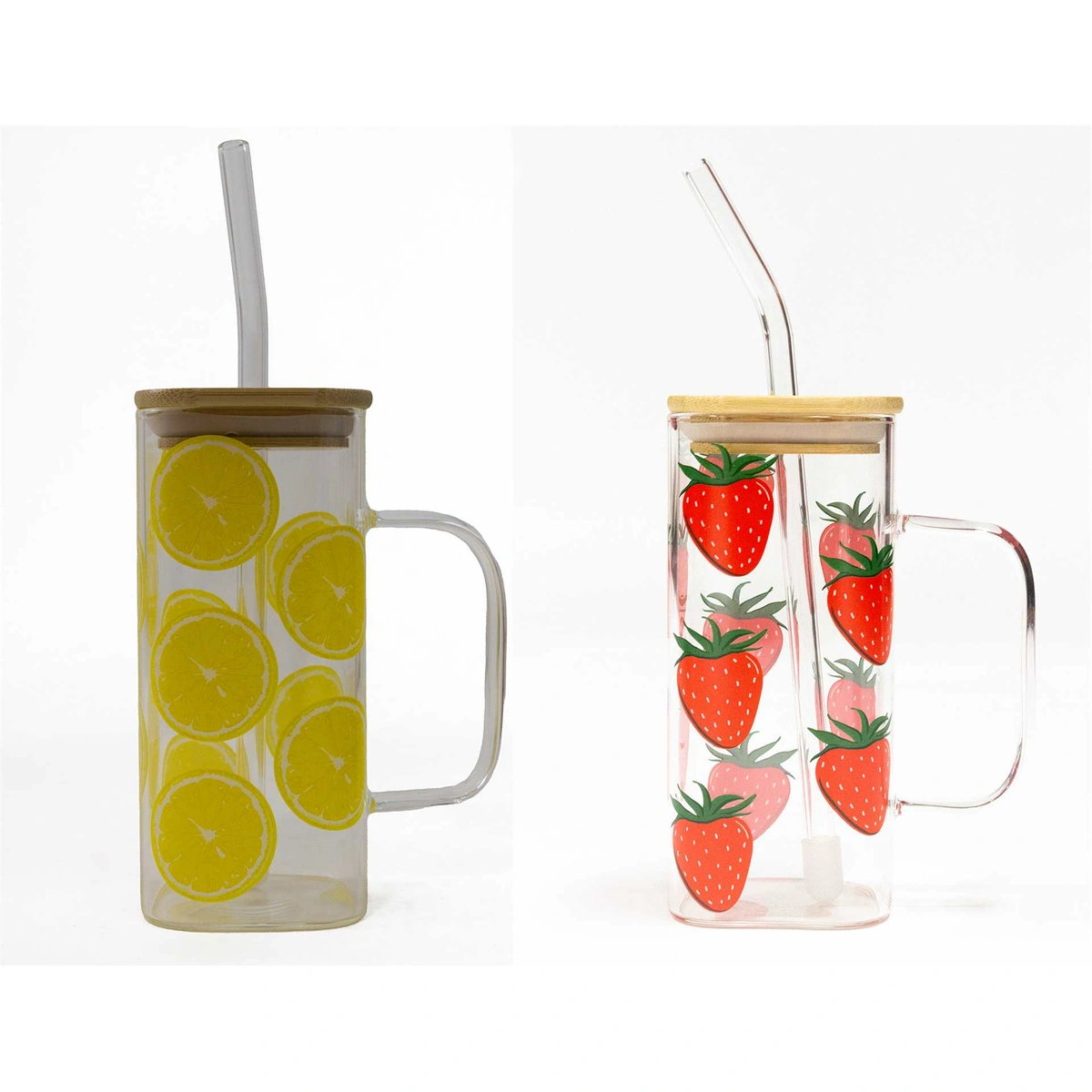 10 Oz. Glass Lemon/Strawberry Tumbler With Wood Lid And Glass Straw. Perfect For Keeping The Pesky Insects Away On The Patio