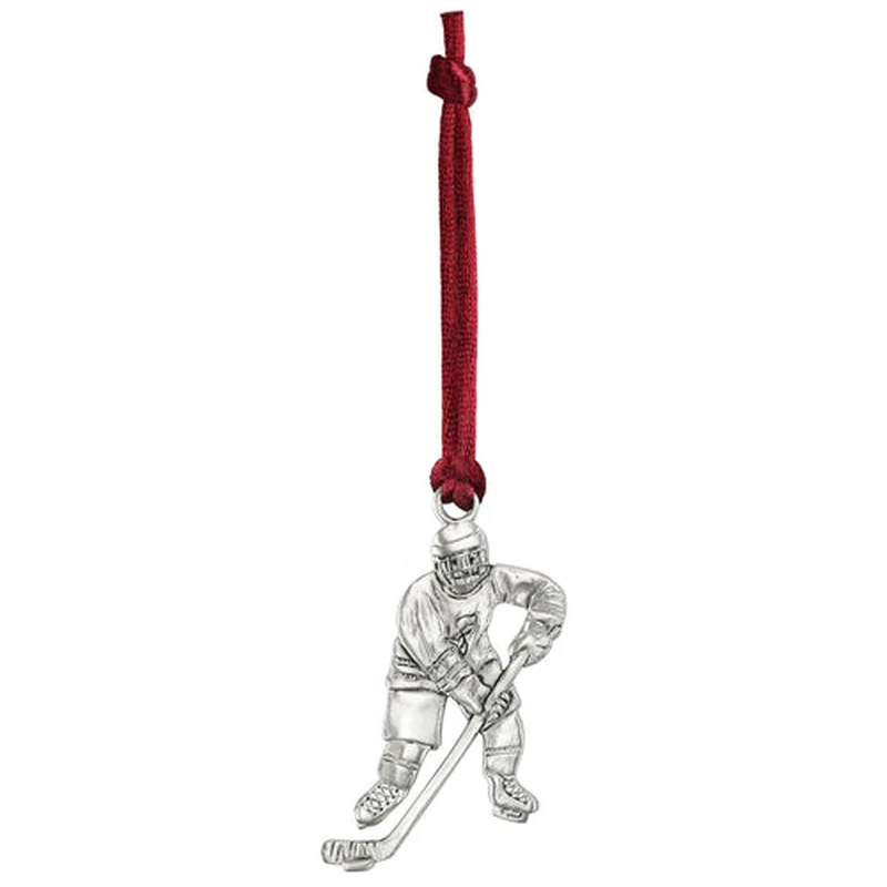 Small pewter ornament, approx 2″. Male Hockey player. Boxed with cord. Satin or Bright finish