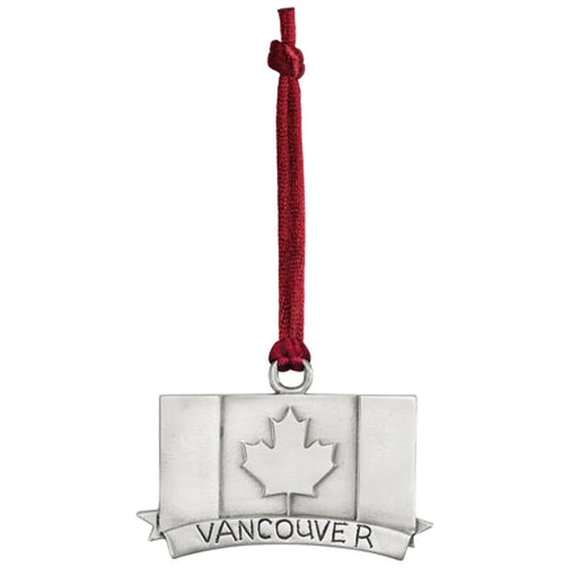 Showcase your Vancouver pride with this patriotic pewter ornament! Featuring the iconic Canadian flag beautifully embossed with “Vancouver,” this 2.25-inch treasure glows with a sophisticated satin finish. Perfect for celebrating your connection to this vibrant city or sharing a piece of Canadian spirit with loved ones. Comes boxed with a ready-to-hang cord, making it an ideal keepsake for your tree or display. Proudly Made in Canada!
