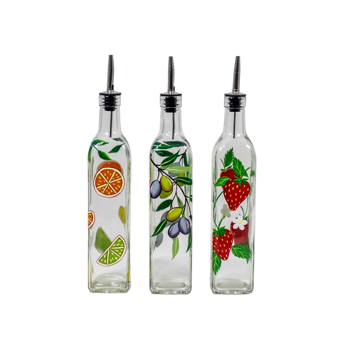 GLASS OIL DISPENSER- CITRUS, STRAWBERRY, OLIVE DECAL- CAPACITY 16 OZ. 304 STAINLESS STEEL SPOUT. HAND WASH ONLY.