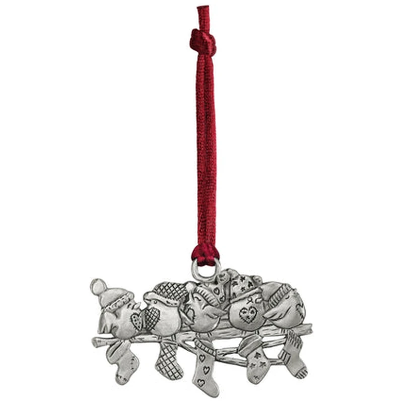 2.5″ W, pewter ornament of birds with caps on their heads and stockings hanging from branch. Boxed with cord included. Satin or Bright finish.